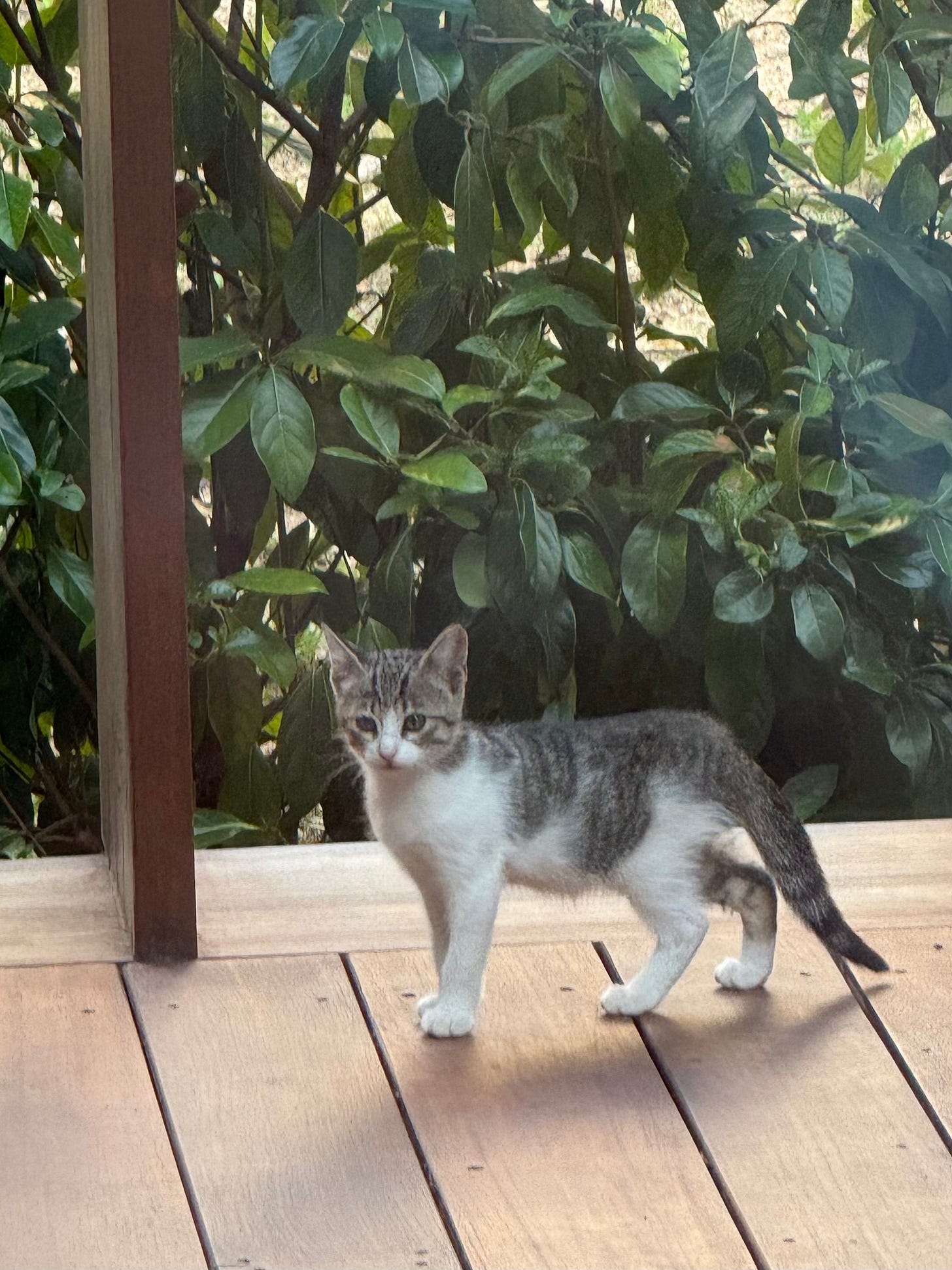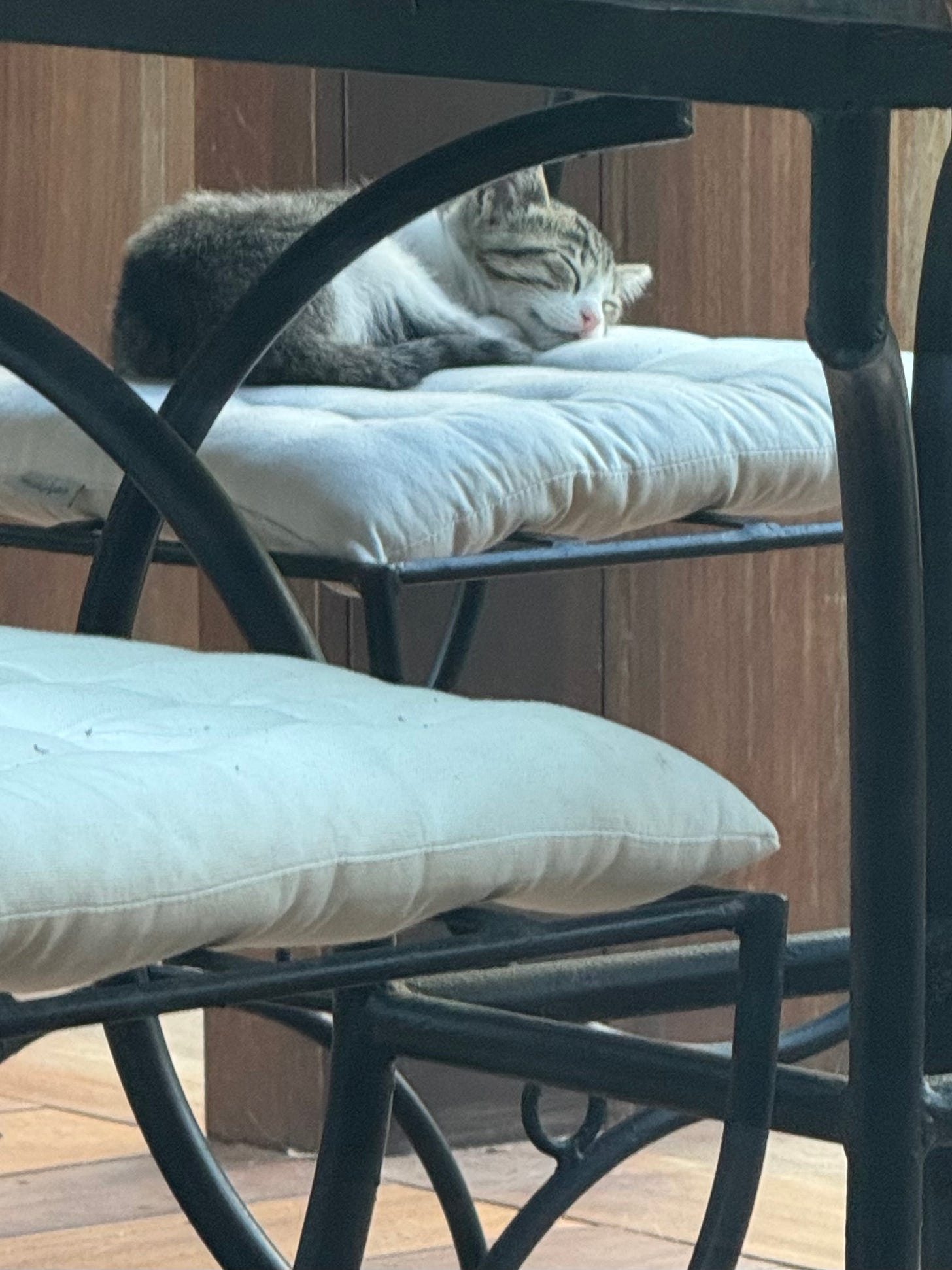 🐈 FAST AND FURRY! 🐈 This summer… chaos has claws. 🐾🐾 Little miracle of nature, born part tiger, part arctic patroller, how you delight me with your look-at-me-now obstacle course swagger. A leap, a claw, and – wow! – you semi-summit the olive tree. I’m on my feet applauding while you box a young offshoot into submission. Upside down now, and…oh! Ha, you fooled me! nothing accidental about that crash-landing! I gasp at how fast you rise, arch, spit, bounce - the crème de la crème of action heroes. Now, the chase! Breakneck speed, slalom precision around the table leg, up, over, behind, through - straight down the aqua-blue plant pot to tackle the eight-legged villain. Then, silence. One chair cushion. One sleepy kitten with a contented smile twitching its whiskers.